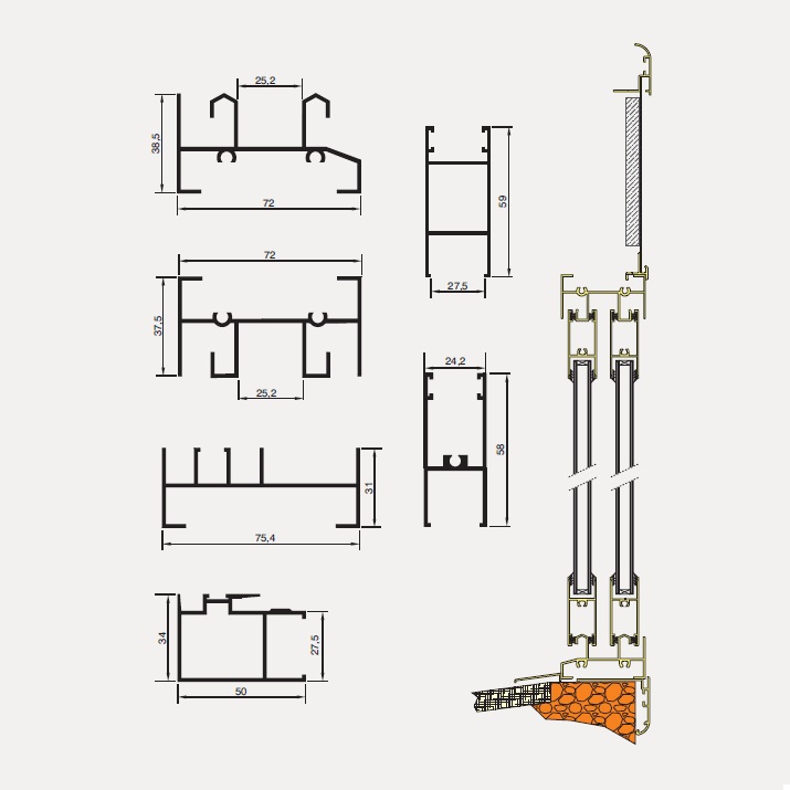 La serie CO-75 de corte recto utiliza herrajes estandarizados bajo la denominación de “Sistema Europeo” por lo que asegura una gran funcionalidad y calidad dentro de la gama económica de correderas.